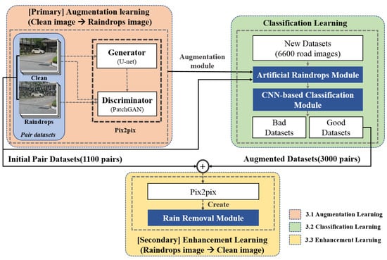The classified images by CNN are added to the input with the existing dataset as learning images in the Pix2pix to supplement the learning to remove raindrops. Augmented data obtained through primary augmentation learning and CNN-based classification learning were used to train the final droplet-removal model. As shown in Figure 3, the good virtual raindrops-image set separated by the CNN classification model from the existing obtained image set was used for the primary augmentation learning, and the resulting image of the augmentation learning module was provided as input to the Pix2pix model used for the final droplet-removal learning.