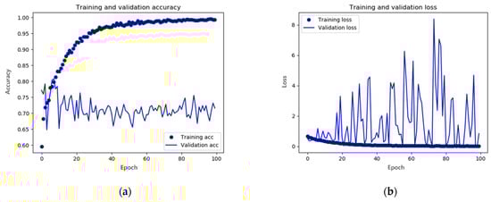 Results of the data-augmented CNN model training: (a) accuracy and (b) loss. In x-axis, epoch represents the number of repetitions for training.