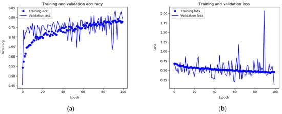 To improve the learning performance, it is necessary to utilize images in which the raindrops are relatively intact. However, it is exhausting to visually identify all the generated images. Therefore, we used a CNN model, which is a deep learning network useful for image discrimination, to classify good raindrops-formation images. To learn the CNN model that classified the corresponding image results, 1100 image pairs used in the primary augmentation learning were used, and according to the classification learning, good and non-good images were classified among 6600 raindrops-formation data. The existing 1100 images of raindrops were added to approximately 3000 images of raindrops and used for secondary learning to enhance raindrops images. The CNN model consists of four convolutional layers with the ReLU activation function, and RMSprop was used as the gradient loss optimization method []. The epoch 100 was set for training. Consequently, the learning figures shown in Figure 6 were obtained.