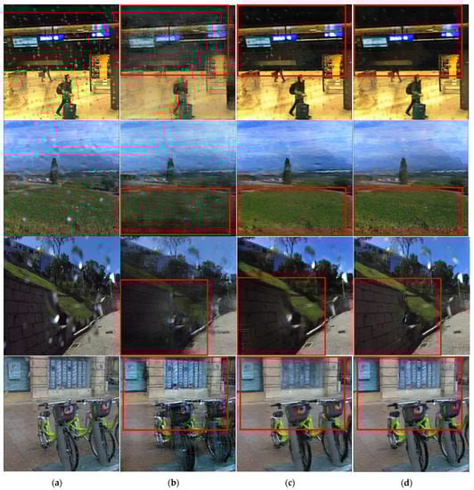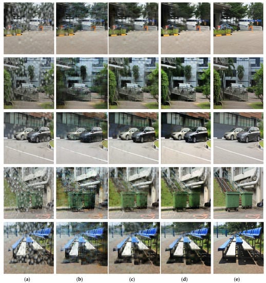 Figure 8 shows the results of the water-drop-removal treatment for an outdoor image that was not used for learning, and a large amount of rainwater was found. Based on the comparison images shown in Figure 8b–d, it was confirmed that raindrops on roads, trees, vehicles and buildings were erased relatively more clearly in Figure 8d than in Figure 8b,c using the conventional method. There was a substantial difference in the water-drop-removal performance compared to that of the existing method for chairs and trash cans. In particular, the detection performance for objects can be expected to improve by sharpening the boundary between the object and the surrounding background.