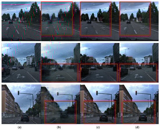 When comparing the results in the red box in Figure 10b–d, the degree of improvement in raindrops removal is at a similar level. However, it was confirmed that information distortion was alleviated for the lane part of the image shown in Figure 10d, and the details of the lanes and arrows were more distinct than those in Figure 10b,c. In addition, the details of the surrounding buildings were expressed more clearly.