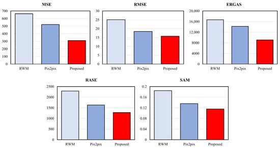 To compare the quality of removed raindrop images, we used 10 total metrics that consisted of mean squared error (MSE), root mean squared error (RMSE), Erreur Relative Globale Adimensionnelle de Synthèse (ERGAS) [], relative average spectral error (RASE) [], spectral angle mapper (SAM) [], peak signal-to-noise ratio (PSNR) [], universal quality image index (UQI) [], spatial correlation coefficient (SCC) [], block sensitive-peak signal-to-noise ratio (PSNR-B) []. The evaluation metrics mentioned above measure quality by comparing the reference image with the resulting image of each method. The lower score of MSE, RMSE, ERGAS, RASE and SAM indicates the better image quality. On the other hand, the higher score of PSNR, PSNR-B, UQI and SCC indicates the better image quality.