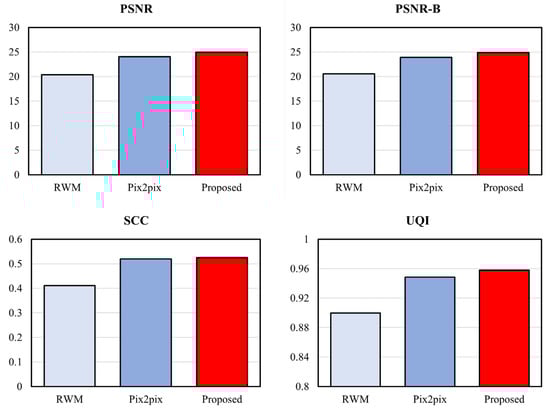 Table 1 and Table 2 and Figure 11 and Figure 12 show the scores of the full reference image quality assessment between the original image and the resulting image. The results show that the image quality of the proposed method is superior to that of other methods.