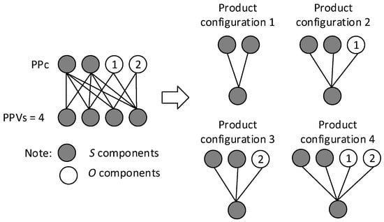 For the purposes of comparing the two product structures, particular volition rules are applied. Component S3 in model A will be selected by an individual selectivity rule (see Figure 5c; model A), while the same component in model B will be selected by an individual selectivity rule (see Figure 5c; model B). Then, the number of all PPVs can be easily determined, as shown in Figure 5c. The number of PPVs equals 12 for the models.
