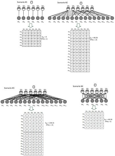 Similarly, the other two scenarios, #2 and #3, can be compared. In both cases, the DMs are coupled. However, the design related to scenario #2 is less coupled than the design in the case of scenario #3. Assuming in general that a less coupled design is less complex than a more coupled one [53] and that the ideal composition of FRs and DPs is considered the simplest one [52], it is possible to say that the variety-based complexity of the DM related to scenario #2 is less complex than the DM of scenario #3. This argumentation corresponds to the values obtained by the indicator SDC, but based on the numbers of PPVs, both designs are equally complex.