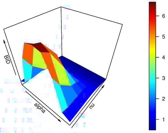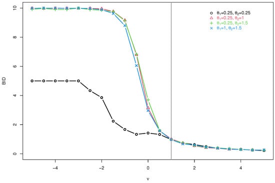 To further explore the dynamic change of the BID with varying from for given and , 0, 0.5, 1, 1.5, or 2, we present the plots of the BID in Figure 2.