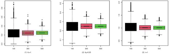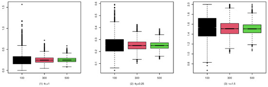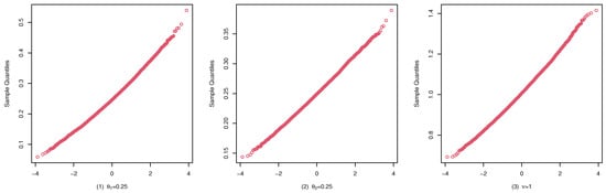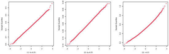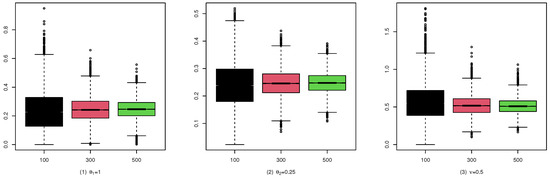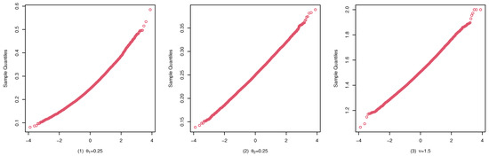 To illustrate the consistency and the asymptotic normality of the CML estimators, we present the boxplots of the CML estimates for (A1), (B1), and (C1) in Figure 4, Figure 5, and Figure 6, and their qqplots with in Figure 7, Figure 8, and Figure 9, respectively. Others are similar and we omit them.