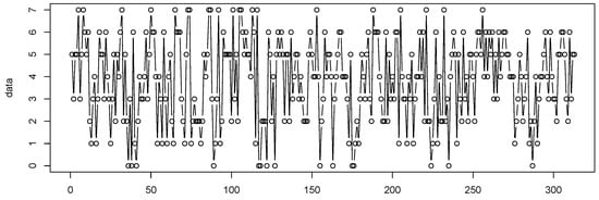 In this section, we consider the number of weekly rainy days for the period from 1 January 2005 to 31 December 2010 at Hamburg–Neuwiedenthal in Germany, where a week is defined as being from Saturday to Friday and The data were collected from the German Weather Service (http://www.dwd.de/, accessed on 12 December 2018). The sample path and the ACF and PACF plots of the observations are given in Figure 10 and Figure 11, respectively.