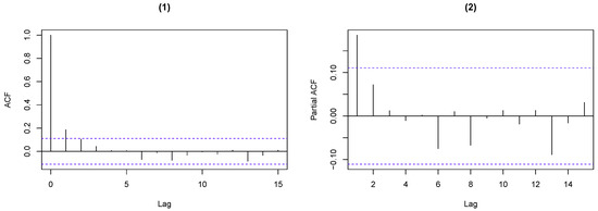 Pearson residual analysis of the weekly rainy days. (1) ACF (2) PACF.