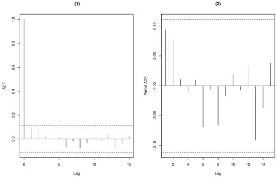 ACF and PACF plots of the weekly rainy days. (1) shows that the ACF exhibits significant value for lag 1, and (2) presents that the PACF indicates an AR(1)-like autocorrelation structure.