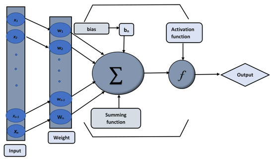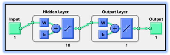where denotes inputs, denotes biased vectors, and denotes connection weights, respectively. The activation function, a log-sigmoid, is used in the feed-forward neural network model, which is expressed as: