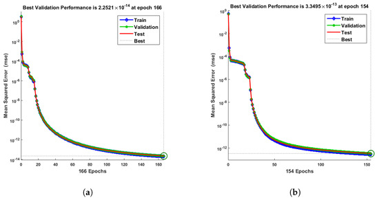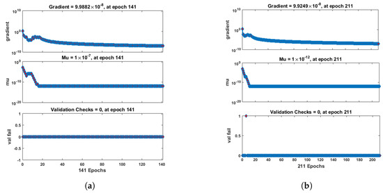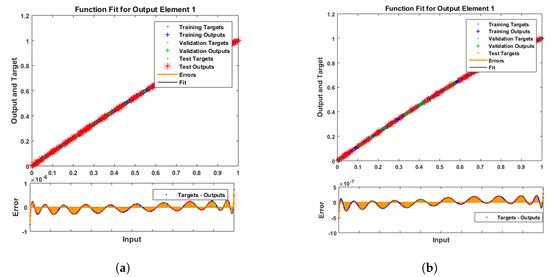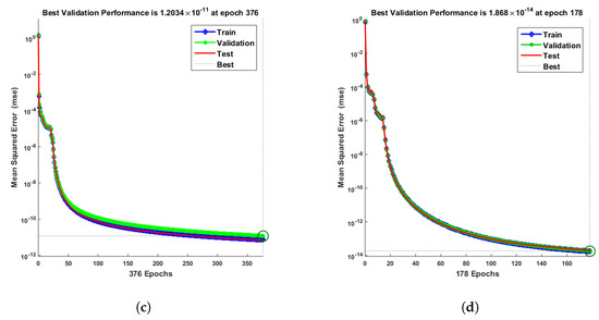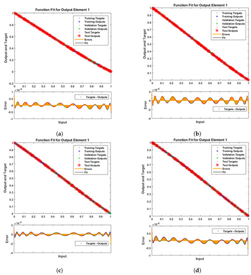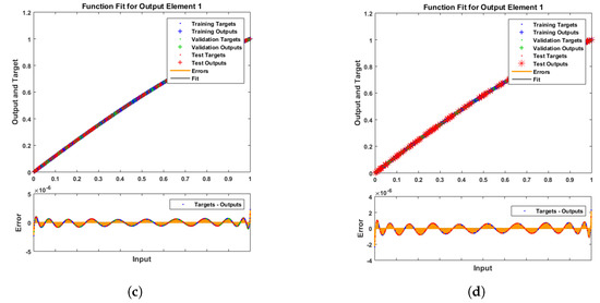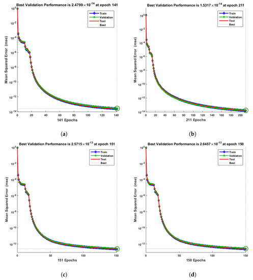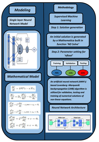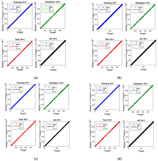 The figures of the numerical solutions of Equations (24) and (25) for dimensionless and ion concentrations were constructed using Matlab software. The network was trained with the backpropagation Levenberg–Marquardt algorithm (BLMA). The NN-BLM technique is simple and has a straightforward framework for dealing with and processing nonlinear situations. The NN-BLMA is a gradient-free approach with a substantially faster convergence rate than other machine learning algorithms and cutting-edge approaches. It contains 70% (701 samples) training data, 15% (150 samples) validation data, and 15% (150 samples) testing data. Ten neurons were used in the fitting network’s hidden layer, as shown in Figure 3. Each neuron contained three weights, and the number of weights increased with the number of neurons. Table 3 displays the parameter settings for carrying out the design plan.