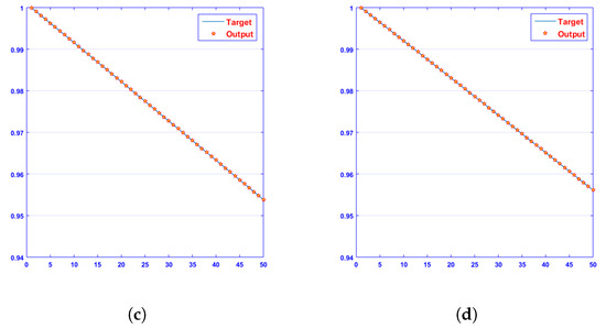 The approximate solutions obtained by a designed algorithm, NN-BLMA, were compared with ’s results, which show the analysis of the phase plane between dimensionless and ion concentrations. It contains 50 points in each case on the y axis. The comparison graphs are closer to the real solution of a surrogate model. The blue line represents targeted data, and red stars with yellow in the center represent the output data of a present surrogate model. Figure 5 demonstrates that at c = 0.1 and c = 0.3, the absolute error ranges between and ; at c = 0.2 and c = 0.4, it ranges between and . Figure 6 demonstrates that at c = 0.1 and c = 0.3, the absolute error ranges between and ; at c = 0.2, it ranges between and ; and at c = 0.4, it ranges between and . The NN-BLM method coincides with the analytical answer, demonstrating the flawless modeling of a surrogate model. The figures show that the concentration of ions increases quickly from its initial value to its steady-state value. It is also clear that dimensionless concentration steadily drops to a steady-state value of zero. Table 1 and Table 2 display the absolute differences between results provided by the NN-BLM algorithm for various instances and the desired data [46,47,48,49,50].