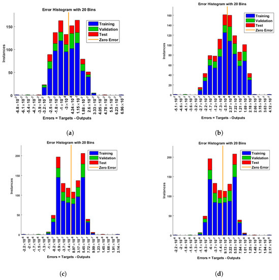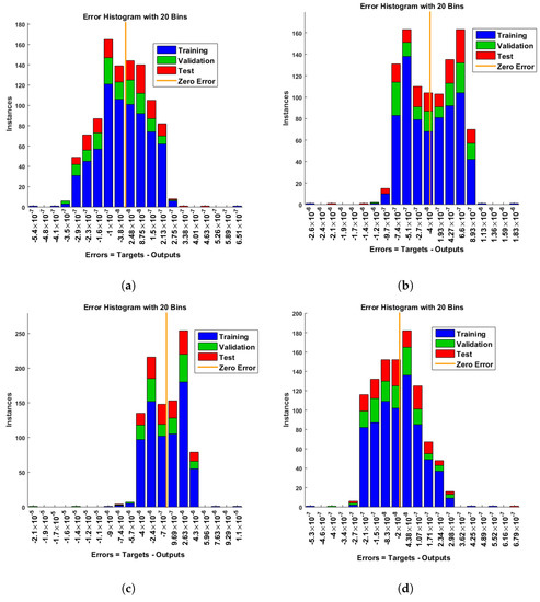 Error histogram analysis of dimensionless ion concentration. (a) At c = 0.1; (b) At c = 0.2; (c) At c = 0.3; (d) At c = 0.4.