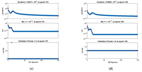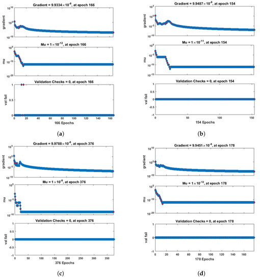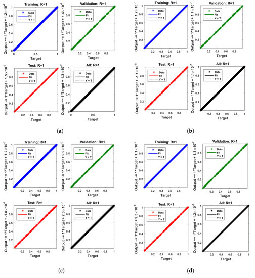 Figure 7 and Figure 8 shows that the approximate solution and targeted data of Equations (24) and (25) for dimensionless and ion concentrations fit well together and have the fewest absolute errors. The absolute error (AE) for dimensionless concentration at c = 0.1 and c = 0.2 lies between and ; at c = 0.3 and c = 0.4, it lies between and . The AE for dimensionless ion concentration at c = 0.1 and c = 0.4 lies between and ; at c = 0.2, it lies between and ; and at c = 0.3, it lies between and . Figure 9 and Figure 10 illustrate the fitting functions of Equations (24) and (25) for the non-dimensional and ion concentrations at different values of the rate constant. Figure 9 shows that the non-dimensional ion concentration increases as the rate constant increases, and Figure 10 shows that the non-dimensional ion concentration decreases progressively as the rate constant increases. Figure 11 and Figure 12 show the performance values of Equations (24) and (25) for the dimensionless and ion concentrations. At c = 0.1, the best validation performance for the dimensionless ion concentration is at epoch 141; at c = 0.2, its value is at epoch 211; at c = 0.3, its value is at epoch 151; and at c = 0.4, its value is at epoch 151. At c = 0.1, for dimensionless ion concentration, its value is at epoch 166; at c = 0.2, its value is at epoch 154; at c = 0.3, its value is at epoch 376; and at c = 0.4, its value is at epoch 178. Figure 13 and Figure 14 show the regression analysis of Equations (24) and (25) for the non-dimensional and ion concentrations for different values of the rate constant. Its value is one, which shows a close relationship between outputs and targets and the accuracy of the problem. Further, the statistical performance of the gradient of Equations (24) and (25) for the dimensionless and ion concentrations at different values of a rate constant is illustrated in Figure 15 and Figure 16. At c = 0.1, for the dimensionless ion concentration, its gradient value is at epoch 141; at c = 0.2, its value is at epoch 211; at c = 0.3 its value is at epoch 151; and at c = 0.4, its value is at epoch 150. At c = 0.1, for the dimensionless ion concentration, its gradient value is at epoch 166; at c = 0.2, its value is at epoch 154; at c = 0.3, its value is at epoch 376; and at c = 0.4, its value is at epoch 178. These figures also illustrate that mu in all cases lies between and . Table 4 and Table 5 show the convergence metric for gradient, mu, epoch, testing, training, validation, and regression. From the above figures, it has been obtained that the dimensionless ion concentration rises quickly from a starting point to one at steady state, and the dimensionless ion concentration decreases progressively from a starting point to one at steady state. It is also implied that the ion concentration increases and ion concentration decreases with increasing the rate constant.