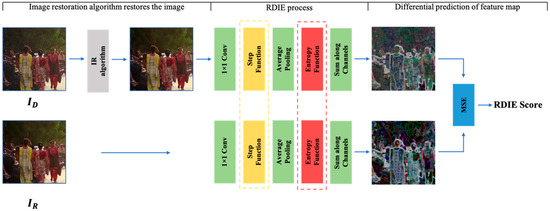 RDIE pipeline. The reference and recovery images are individually passed through the RDIE model algorithm. RDIE first spatially maps the image by 1 × 1 convolution. Subsequently, grayscale grading is achieved using the transitive function. The frequency of each gray level in the region is counted by average pooling, and finally, the regional entropy feature map is obtained by the entropy function and summed.