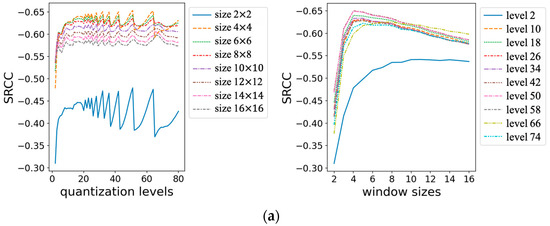 The main factors affecting RDIE are the sliding window size, quantization level, and stride. In this study, extensive experiments were done with PIPAL to find the optimal parameters, using a grid search method with window sizes from 2 to 16 and quantization levels from 2 to 80. In this paper, we define , where denotes the window size and denotes the quantization level. For example, denotes an RDIE method with a window size of 10 10 and a quantization level of 16. Because it is difficult to directly display so many results, we only selected some of them for the purpose of drawing curves.