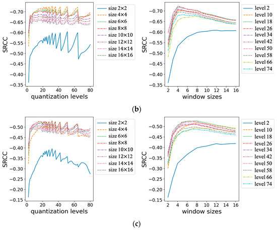 SRCC with different quantization levels and window sizes: (a) traditional method; (b) PSNR-oriented method; and (c) GAN-based method.