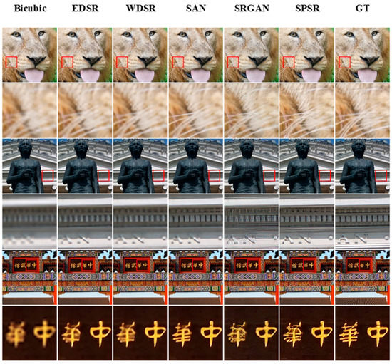 Bicubic as a traditional interpolation algorithm is undoubtedly the least effective, EDSR and WDSR are very similar, and SAN is much better, especially for the shape edges of the characters’. SPGAN and SPSR yielded a more realistic natural texture, and because SPSR introduces additional edge loss, the edges have a higher definition and therefore higher perceived quality.
