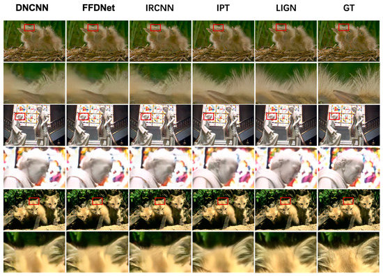 The denoising results are shown in Figure 6. DNCNN, FFDNet, and IRCNN all remove the noise better, but the image information retention is poor, especially in terms of edge details. IPT is significantly better than FFDNet and IRCNN and has the highest PSNR. LIGN enhances the denoised image detail texture, which is lower than IPT on PSNR but has the best perceptual quality.
