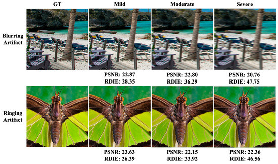 This experiment explores the sensitivity of the regional information entropy to artifacts. Two common artifacts, motion and ringing artifacts, are synthesized in the test image species, and the generated results are evaluated and compared using RDIE and PSNR methods, respectively. The results are shown in Figure 8. As the intensity of artifacts increases, a significant decrease occurs in the subjective perception of image quality. RDIE is similar to the subjectively perceived image quality. As blurring and ringing levels increase, the RDIE metric results also substantially increase, indicating a decrease in image quality. However, the change in the PSNR index value is minimal, specifically, the subjective perception of heavy ringing image quality is significantly worse than that of moderate ringing. However, the PSNR index has instead increased, which is significantly inconsistent with subjective perception.