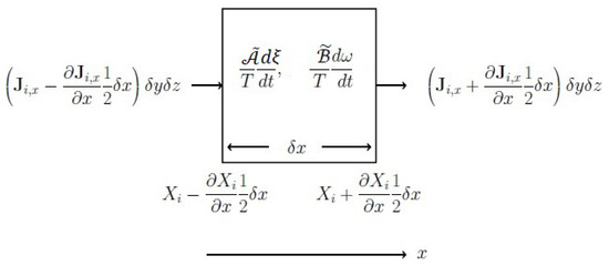 Notice that each term of Equation (17) is a product of flux and its driving force. In Figure 4, for the sake of illustration, we have depicted in one dimension of the processes taking place within and across a tiny volume element of a non-uniform fluid and variation of intensive properties on account of existing gradients. is the flux density of the i-th process in the x-direction and is the i-th intensive property. Moreover, there are two last terms on the r.h.s. of Equation (17) but do not appear in Equation (5) the latter equation in CIT is understood to be valid for a system with existence of physical fluxes. These three terms of Equation (17) along with the use of and take care of the irreversibility associated with the nonequilibrium population of the molecular quantum states. Where the expression of , the internal population equilibration affinity through the collisional mechanism reads as