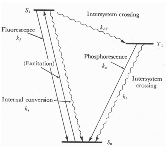 A schematic representation of the photo-physical processes, the Jablonski diagram for an organic molecule. It is a convention to represent the radiative transitions by straight arrows, ⟶, and the non-radiative ones by ⇝. is the rate constant for the non-radiative intersystem crossing between the excited singlet () and the triplet state (), is the rate constant of fluorescence emission from the singlet state (), is the rate constant for internal conversion between singlet states (herein shown between and ) and is the rate constant for the non-radiative intersystem crossing from triplet () to ground singlet state .