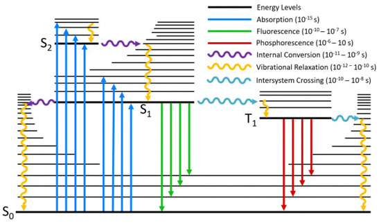 A schematic representation of the various electronic energy levels (singlet ground state , first and second singlet excited states and , and the first triplet excited state ) for an organic molecules and associated processes with corresponding time scales.