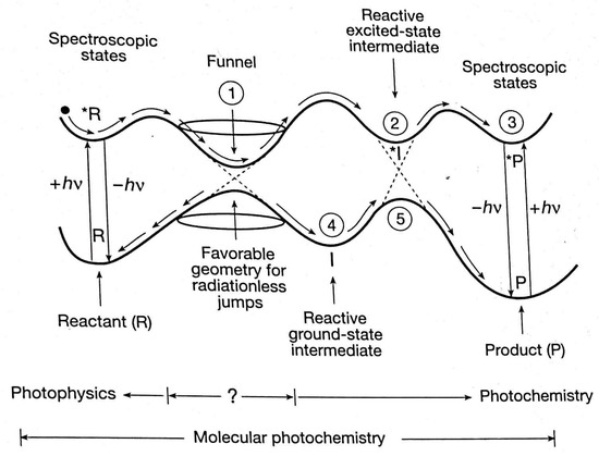 A representative potential energy surface for photochemical reaction through the highly reactive intermediate . The lower surface starts with the ground singlet state, and is the pathway of thermal reaction. The upper surface starts with its excited singlet state, say, and describes the photochemical adiabatic pathway with excited state highly reactive intermediate . For the sake of simplicity, the potential energy surfaces of and as well as that of and are assumed to be vertically similar. The "?" indicates a "twilight zone", where the distinction between photochemistry and photophysics is fuzzy. This region is termed as funnel, the region ➀ (this diagram was taken from [60]).