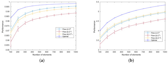 Comparison of the achieved total compatibility for Flows (i), (ii), and (iii), as described in the caption for Figure 2. Each graph shows the mean and standard deviation of the performance of 100 different compatibility matrices with each given number of elements, simulated under (a) uniform distributions and (b) Poisson distributions.