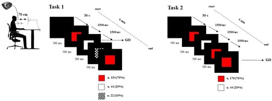 The protocol study consisted of a baseline (resting state condition) lasting 5 min and two different tasks. The tasks consisted of 220 visual stimuli with 12 × 12 cm red, white, and chess pattern squares on a black background. The first task included three distinct visual stimuli: red squares (frequent stimulus n.154—70%), white squares (rare stimulus n.44—20%), and a chess pattern with squares (distractor n.22—10%). It was based on fundamental response inhibition. A working memory response inhibition task made up the second. There were just red (common stimulus n.176—80%) and white (rare stimulus n.44—20%) squares in this instance. Each stimulus had a 1500 ms gap in between them, and each stimulus lasted 500 ms. The subject had to press the spacebar on the keyboard during the first task when the white square appeared, and during the second task when two successive visual stimuli of the same color were shown (Figure 1).