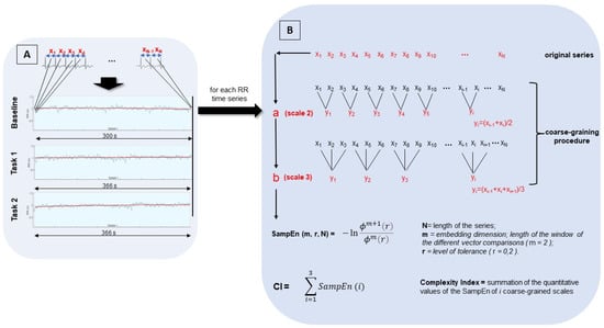 Multiscale Entropy and Complexity Index Scheme. (A) For each subject the tachogram was extracted in baseline, task 1, and task 2. N represents the length of each original detrended (trend line in red) time series (baseline N = 422 ± 100; task 1 N = 509 ± 83; task 2 N = 524 ± 102). (B) The sample entropy (SampEn) was calculated for the original and coarse-grained series A and B, setting the parameters m and r at 2 and 0.2, respectively. The complexity index (CI) was calculated as the sum of the SampEn of the scales 1 (original series), 2 (a), and 3 (b).