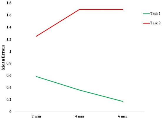 The number of errors were lower in task 1, with a decrease over time. Conversely, they increased over time in task 2 (Figure 3).