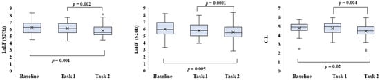 In the group, significant differences between baseline and Task 2, with a decreasing trend, were found for LnLF (Z = −3.189, p = 0.001, r = 0.38), LnHF (Z = −2.726, p = 0.005, r = 0.32) and CI (Z = −2.317, p = 0.02, r = 0.27). The same parameters showed significant differences comparing task 1 and task 2 (−3.473 ≤ Z ≤ −2.789, 0.0001 ≤ p ≤ 0.004, 0.33 ≤ r ≤ 0.41) (Figure 4).