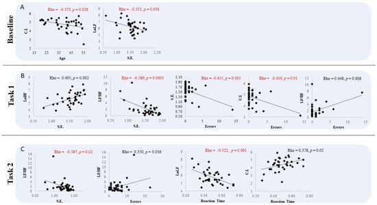 In baseline, CI had a negative correlation with age (Rho = −0.373, p = 0.026) and the SampEn with the LnLF (Rho = −0.351, p = 0.036). In Task 1, the SampEn had a positive correlation with LnHF (Rho = 0.495, p = 0.002) and negative correlation with LF/HF (Rho = −0.589, p = 0.0001), while CI and SampEn had a negative correlation with the errors (Rho = −0.455, p = 0.005 and Rho = −0.419, p = 0.01, respectively) and positive correlation with LF/HF (Rho = 0.448, p = 0.006). In Task 2, LF/HF had a negative correlation with SampEn (Rho = −0.387, p = 0.02) and positive correlation with the errors (Rho = 0.350, p = 0.036), while the Reaction Time had a negative correlation with the LnLF (Rho = −0.522, p = 0.001) and positive correlation with the CI (Rho = 0.378, p = 0.02). Excluding the outlier from the analysis overall patterns of significant findings did not change (Figure 5).