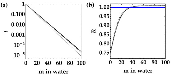 Transmission coefficient t (panel (a)) and noise reduction factor R (panel (b)) as a function of the distance traveled in water for Jerlov water types from I to III. In panel (b), we set , , and . Black solid curves correspond to type I water ( = 0.0460 m), gray dashed curves correspond to type II ( 0.0469 m), and dark-gray dotted curves correspond to type III ( 0.0507 m). The transmission coefficient is shown in semi-log scale. The blue straight line in panel (b) corresponds to the condition .