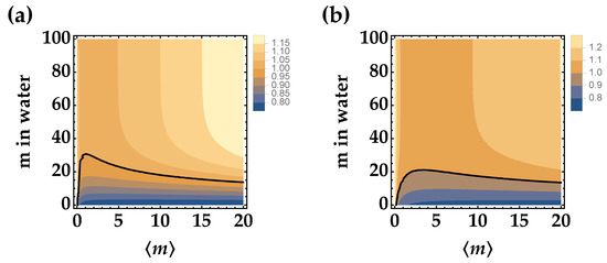 The results are shown in Figure 2 as a contour plot according to Equation (5), in which t is still modeled as , and for , that is for a zero-mean noise source. Indeed, when is different from 0, the situation changes. In particular, in view of implementing the communication protocol mentioned in the Introduction [20], it is interesting to investigate what happens when a small contribution of pseudothermal noise is added to one TWB arm.