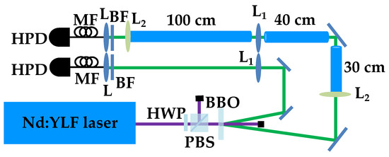 Sketch of the experimental setup. HWP: half-wave plate; PBS: polarizing cube beam splitter; BBO: -barium borate crystal; L1: 1000 mm focal length lens; L2: 2000 mm focal length lens; BF: band-pass filter; L: achromatic doublet; MF: multi-mode optical fiber; HPD: hybrid photodetector. See the text for details.