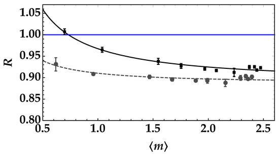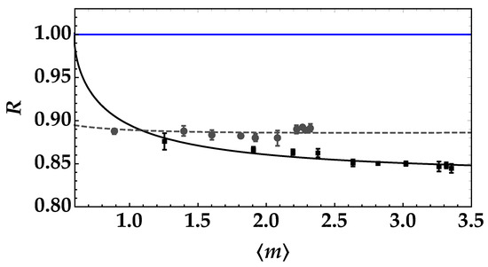 Noise reduction factor as a function of the mean number of detected photons in each arm for the pseudothermal noise signal with the highest mean value (black squares + error bars) and for the pseudothermal noise signal with the lowest mean value (gray dots + error bars). The theoretical fitting function according to Equation (5) is superimposed on each data set with the same color choice. The values of the fitting parameters for black data are: and , while those corresponding to gray data are: and . The blue straight line corresponds to the condition .