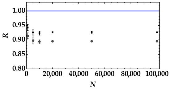 In Figure 8, we show the noise reduction factor as a function of the number of data for the pseudothermal signals with the highest mean value (black data + error bars) and the lowest mean value (gray data + error bars). In both cases, the mean number of detected photons of the TWB is equal to . We can notice that a data sample equal to 1000 shots is enough to discriminate the two states even if the error bars decrease at increasing sample size.