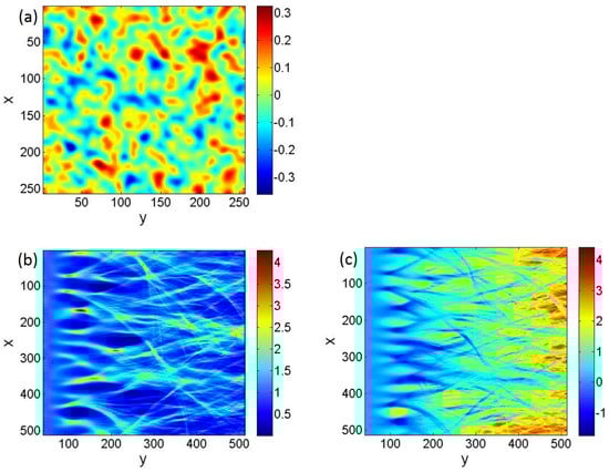 (a) A Gaussian random potential generated on a 256 by 256 grid with zero mean, standard deviation , and a Gaussian two-point correlation function with correlation length . The potential is constructed by starting with delta-shaped peaks on a square grid with spacing unity, and then convolving with a Gaussian, as described in Equation (5). (b,c) The ray density and stretching exponent of particles scattered in the random potential field shown in (a), but with x and y rescaled to a 512 by 512 grid. Here (b) shows the particle density , with intensity normalized to unity before scattering, and (c) shows the normalized average stretching exponent . The correlation is clearly negative; i.e., higher densities in panel (b) are associated with a lower stretching exponent in panel (c).