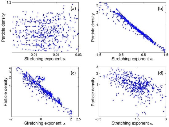 Scatter plots of density vs. stretching exponent before, during, and after the first generation of hot spots (around y = 80–130). (a–d) represent data for (before), (during), (during), and (after), respectively.