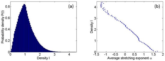 (a) Probability distribution of particle density I in the region . (b) Average stretching exponent in the same region, with each data point corresponding to one bin in panel (a).