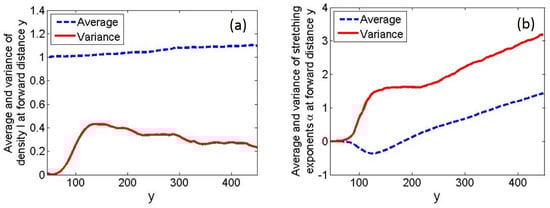 Evolution of intensity and stretching-exponent statistics as a function of forward travel distance. (a) Average and variance of the density at forward travel distance y. (b) Average and variance of the stretching exponent at forward travel distance y.