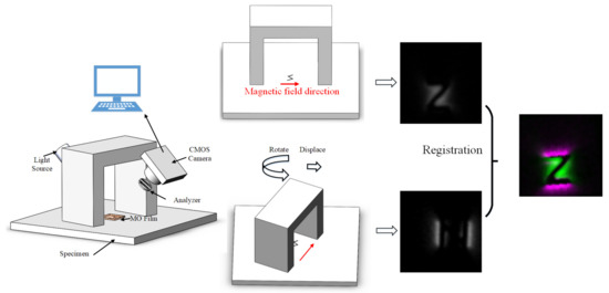 Figure 4. The angle between the MOI system and the magnetic yoke is fixed to keep the direction of the external magnetic field in the captured images. Additionally, the performance of registration would be better when the rotation angle comes to the position where the images are complementary. (Complete information about defects can be obtained at an angle of about 80