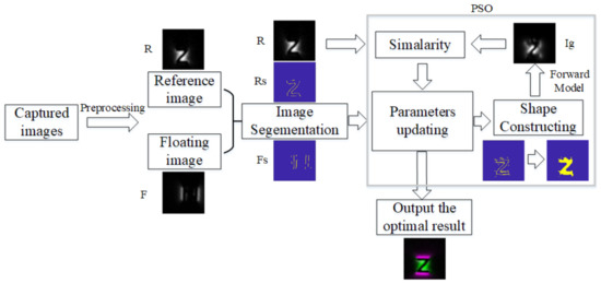 Figure 2). The proposed method combines the MFL forward model and the multi-model image alignment method. Firstly, the PSO optimization method updates the image transform parameters and generates a new defect shape according to the aligned images. Then, the MFL field distribution of the new reconstructed shape is generated via the use of the solenoid model [