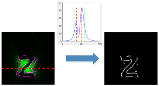 The first step is in segmenting the original images to extract the partial edge of the defects. The MFL field distribution among the edge of defects is usually sharp because the magnetic line leaks out from the edge, and the intensity decreases as the distance grows. Such a distribution could be presented by the gray intensities of the captured images. The Laplacian of the Gaussian (LoG) filter, which could be approximated by using the Difference of Gaussian (DoG), shows a good performance in identifying the edge of the defect [