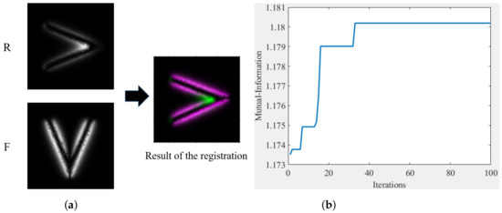 If the images are geometrically aligned, the MI of the image intensity values for the corresponding pixel pairs should be maximum. This criterion is very general and robust. It can be applied automatically without prior segmentation, because no assumptions about the relationship between the two image intensities are made. These properties are appropriate for calculating the similarity between the generated and original graphics, so here, we use MI as a registration criterion.