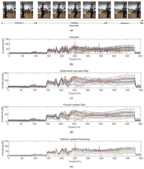 Moreover, Wang et al. [58] also demonstrate that traditional low-pass filters or median filters tend to achieve less-than-satisfactory performance in CSI denoising. As shown in Figure 1, we use the Butterworth low-pass filter that has a sampling rate of 1000 samples per second, and the ten-point median filter to denoise the CSI of Figure 1b respectively. It can be seen that compared to the original CSI, the CSI after filtering becomes very smooth. In addition, even during volunteer activities, the amplitude change of CSI is almost negligible in every small range. It indicates that the hidden pose features of CSI are filtered too. Undoubtedly, it will bring difficulties to the feature extraction of the network.