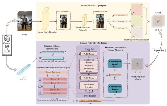 The Alphapose-based teacher network is a two-step framework to analyze the input image and extract 18 skeleton point coordinates to form the SAM. The student network CSI-former is composed of the attention mechanism and convolutional neural network to extract a pose estimation matrix that is adapted to the SAM size from the CSI. Under the supervision of the teacher network, the student network continuously optimizes learning until it achieves the ability of CSI-based pose estimation.